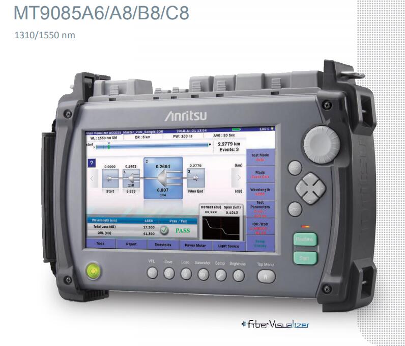 光脈沖測試可測量光纖傳輸損耗和光纖長度并檢測光纖連續(xù)性斷裂等事件。MT9085A-063光時域反射儀同時支持單模和多模光纖,且產(chǎn)品線包括支持與測量環(huán)境匹配的各種波長。易于使用的光纖可視器功能使用兩種類型的實時掃描(高速、高 S/N)來檢查光纖連接和彎曲的狀態(tài),同時可測試波形;MT9085C-053可檢測( 46 dB 動態(tài)范圍,0.8 m 盲區(qū))的光纖事件并測量損耗。出色的波形質(zhì)量支持從短距離到長距離的光纖測量,包括 PON 和實時測量。
