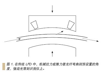 傳統(tǒng)在線光纖檢測儀(LFD)通過用拇指將光纖彎曲成固定角度,使檢測儀讀取護(hù)套中的功率泄露(見圖 1)。