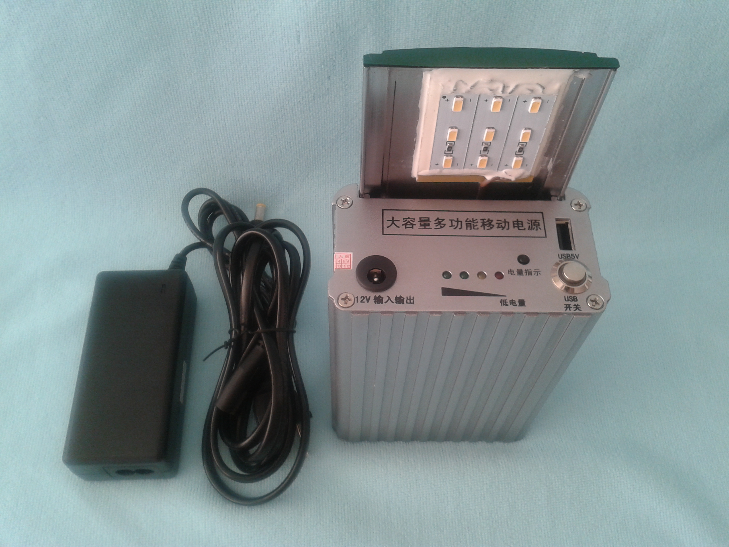 4. 多功能加固型雙USB 5V輸出,接口堅(jiān)固耐用,可以同時(shí)為手機(jī)等多種移動(dòng)設(shè)備充電,并配有高亮LED照明臺(tái)燈,(可單獨(dú)不間斷照明48小時(shí))照明方向可以根據(jù)需要隨意調(diào)節(jié),滿足您在光線不足或者夜間施工光纜熔接需要。