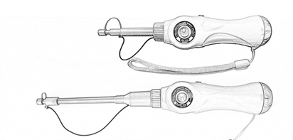 拇指和食指用力按下紅色按鈕不松手;向上或向下輕輕撥動清潔器前端;松開按鈕。