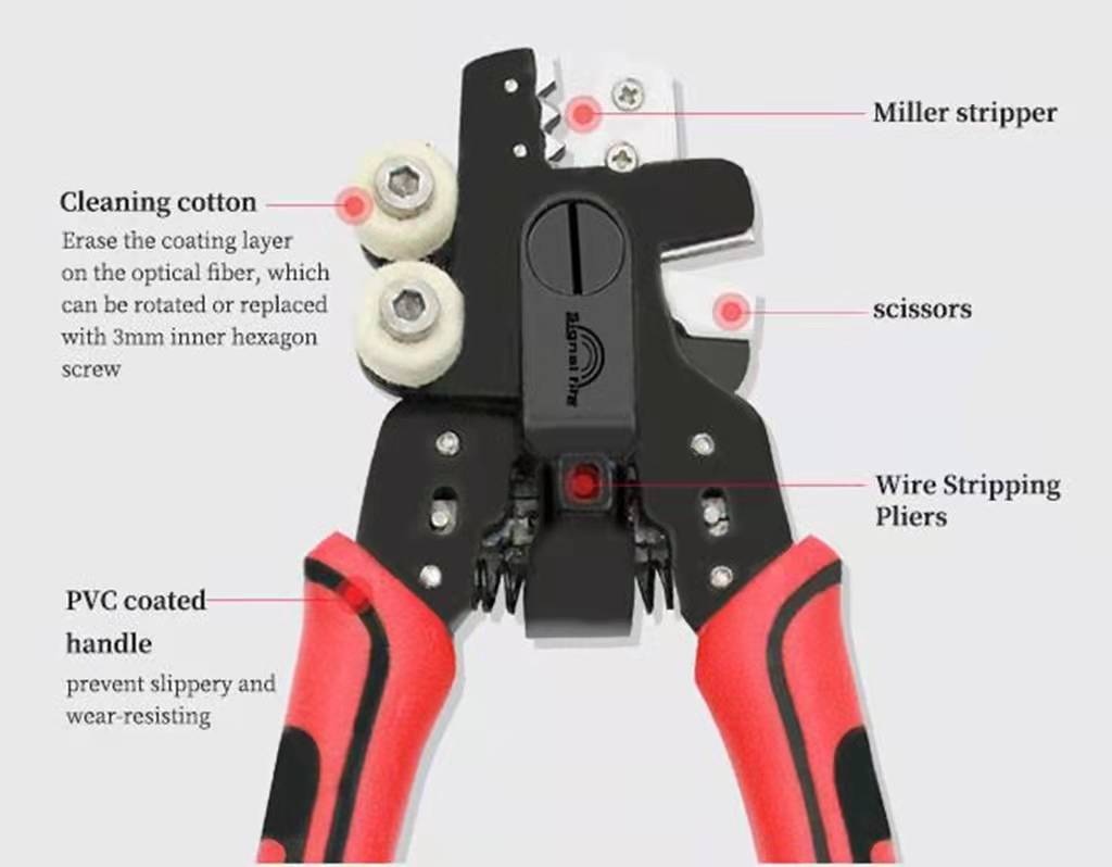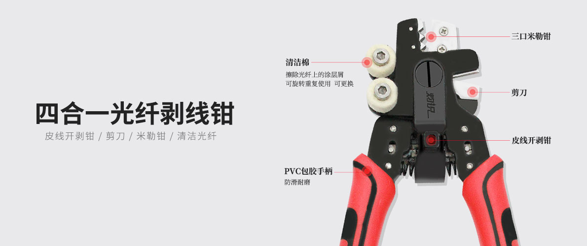 多功能光纖剝線鉗OFS-04一把鉗子集成了三口米勒鉗、皮線開(kāi)剝鉗、剪刀、清潔棉四項(xiàng)功能,簡(jiǎn)化了工具箱物品的攜帶,在剝纖工作中避免頻繁更換工具,提高了工作效率,操作簡(jiǎn)單,一鉗多用。