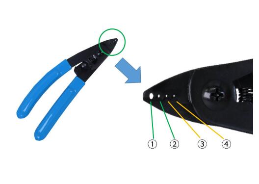 SS05光纖剝纖鉗可以同時剝除2根裸光纖涂覆層,四孔剝纖鉗孔徑分別為①2,3mm孔徑可以剝除跳線外皮,②900微米可以剝除光纖束管保護層,③④兩個250微米孔徑可以同時剝除2條光纖的涂覆層。