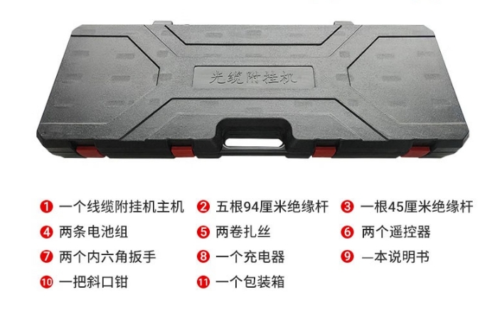 R8主機(jī)一臺,電池2塊,絕緣附掛桿6節(jié),可視窗遙控器,充電器1個,水口鉗1把,使用說明書1份,扎絲2卷,攜帶箱一個。